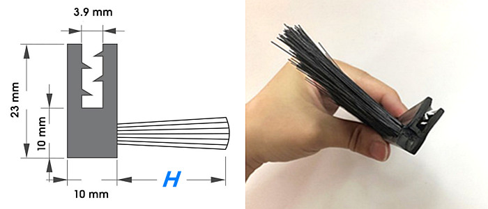 Deze flexibele borstel is gemaakt voor het afdichten en beschermen van wielkasten en andere voertuigonderdelen, met name voor bussen.Het bestaat uit een flexibele rubberen basis in clipvorm, voorzien van nylon borstelharen. De borstelharen zijn in de zijkant van de rubberen basis geknoopt en vormen een structuur in een hoek van 90 graden, vandaar dat het ook wel bekend staat alsZijborstel met flexibele stroken.