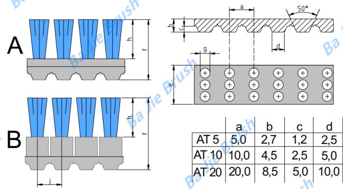 Ons Tandriemborstel Bestaat uit PU-tandriem en borstelharen, geschikt voor toepassingen die verticale en horizontale reiniging vereisen. De borstel is verkrijgbaar in zes standaard riemprofielen: