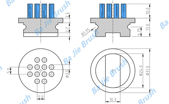 A Turret Button Brush, ook wel bekend als een Knopenbedborstel of Knoppenborstel TabelcomponentDit is een ronde borstel met nietjes, speciaal gemaakt voor revolverponsmachines. Elke borstel is gemaakt met een ronde plastic voet En zachte nylon borstelharen Deze borstels ondersteunen het plaatmateriaal tijdens het ponsen, waardoor krassen, deuken of beschadigingen aan het oppervlak worden voorkomen. Omdat de vorm op een knoop lijkt, wordt hij vaak een "knoopborstel" genoemd. Tijdens de productie worden meerdere gaten in de plastic basis geboord en gevuld met dichte nylon plukjes, waardoor een duurzaam en langdurig ondersteunend oppervlak ontstaat.